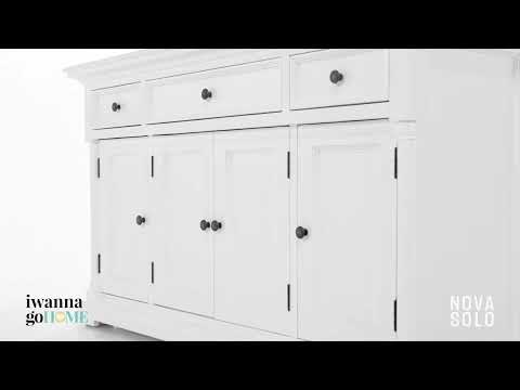 This beautifully designed buffet features 3 drawers, 5 doors and 6 internal shelving compartments. The two-column design on the exterior adds a touch of sophistication and charm, making it a true statement piece in any room. The classic white painted semi-gloss finish gives it a sleek and elegant look that's perfect for any home decor.