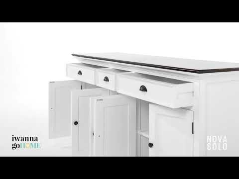 A stunning farmhouse sideboard designed to bring both style and function to your home. With five doors and three drawers, this unit provides ample storage space for all your household needs. Featuring a distressed white finish with a deep brown stained top, this unique combination of finishes creates a charming and rustic look that's perfect for any home. The antique brass hardware adds a touch of elegance and sophistication, while the mahogany frame ensures that this sideboard is built to last.