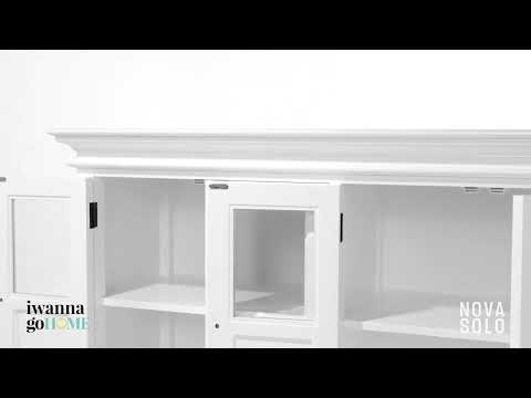 French countryside meets Eastern seaboard in this four-door buffet, which features bevelled glass doors as well as four internal shelving compartments. Its solid mahogany frame is finished in Classic White — a perfect complementary colour — while its Antique Brass hardware adds a shot of depth and warmth. Suitable for a living room, dining room or even a hallway, this buffet brings storage — and style — where you need it.