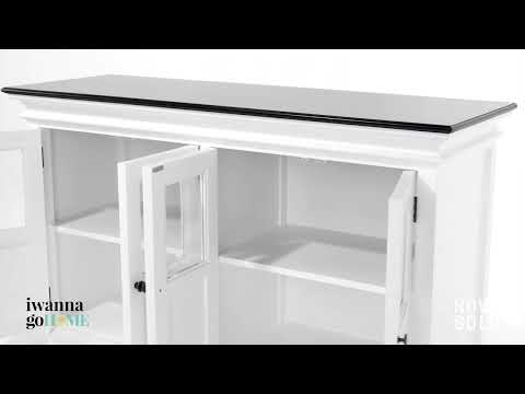 French countryside meets Eastern seaboard in this four-door buffet, which features bevelled glass doors as well as four internal shelving compartments. Its solid mahogany frame is finished in Classic White with a Black Painted top, while its Antique Brass hardware adds a shot of depth and warmth. Suitable for a living room, dining room or even a hallway, this buffet brings storage — and style — where you need it.