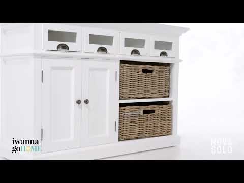 Storage versatility and rustic farmhouse appeal are charmingly presented in our kitchen buffet. Glass-fronted drawers provide a window to the contents, and are ideally suited for all your kitchen flatware and utensils. Two generous handwoven kubu rattan baskets are perfect for linens, dry goods or large utensils. Fixed shelving, hidden behind the shaker style doors, can easily house any of your dining needs.