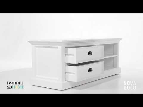 The low profile of this entertainment center offers the perfect platform for showcasing all your media components. Television viewing is at the perfect height and shelving provides ample allowance for additional electronic devices. Cord cutouts are in place for ease of connectability. Drawers can house smaller accessories and instruction manuals. The solid wood construction with detailed molding, is highlighted with a semigloss painted finish. Flared crown molding and detailed trim add simple elegance to the piece. Antique brass hardware completes the look.