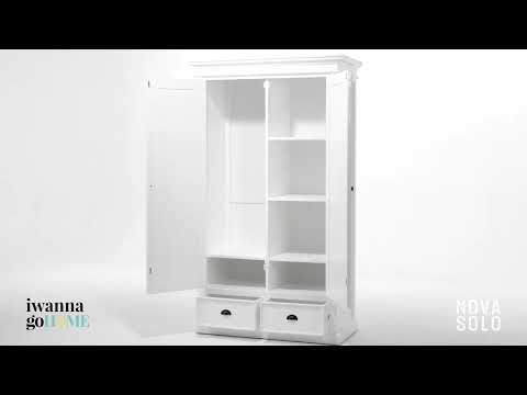 Add this mid-sized wardrobe, with its charming yet modern aesthetic, to your bedroom for additional storage and style. Handcrafted from kiln dried solid mahogany, the combination of hanging space, interior shelving and two drawers at the base offers a space for everything. This piece is finished in classic white – a perfect complementary colour – and features antique brass hardware.
